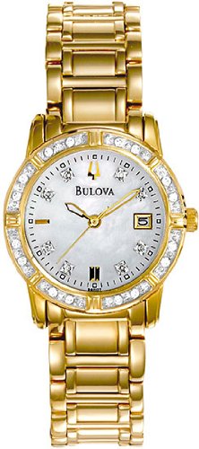Gold-tone stainless steel case with a gold-tone stainless steel bracelet. Fixed gold-tone bezel set with diamonds. White mother of pearl dial with luminous hands and diamonds hour markers. Minute markers around the outer rim. Date displays at the 3 o'clock position. Quartz movement. Solid case back. Hidden folding clasp. Water resistant at 30 meterts / 100 feet. Bulova Ladies Diamond Watch 98R135.