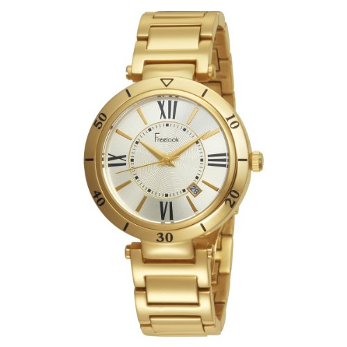 The Freelook Women's Gold Tone Stainless Roman Numeral Watch shows off a simple design in elegant fashion. The gold-tone stainless steel case complements a gold-tone bezel with black Arabic numerals at each ten-minute mark and indices marking the five-minute positions. A champagne dial features black Roman numerals at the three, six, nine, and 12 o'clock positions and gold-tone stick indices at all other hours. Gold-tone hour, minute, and second hands, a black inside minute track and date window between the four and five o'clock all add to the smooth black and gold style of this timepiece. The comfortable silver-tone stainless steel bracelet securely fastens by deployment clasp. This timepiece features reliable Japanese quartz movement, and a durable mineral crystal protects the analog display. This watch is water resistant to a depth of 165 feet (50 meters).