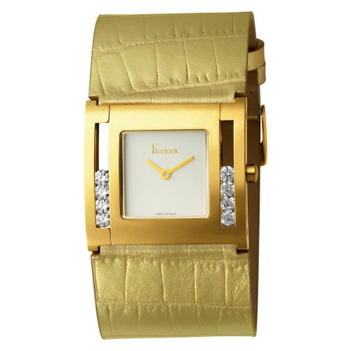 The Freelook Women's All Gold Tone Leather Band Watch easily doubles as an exquisite cuff-style bracelet and incorporates seamlessly into the modern woman's jewelry box. The soft, gold-tone leather watchband with a buckle-style clasp is extra-wide and looks both modern and luxurious at the same time. The gold-toned stainless steel case is as wide as the watchband for a sleek, seamless look. The unique, "cut-a-way" look of the bezel is embedded with four Swarovski crystals on each side. The square-shaped face is dainty and minimalist with a champagne-colored dial displaying gold-toned hour and minute hands. The mineral crystal offers durability and scratch resistance. Plus, the Freelook Women's All Gold Tone Leather Band Watch is powered by Japanese quartz movement.