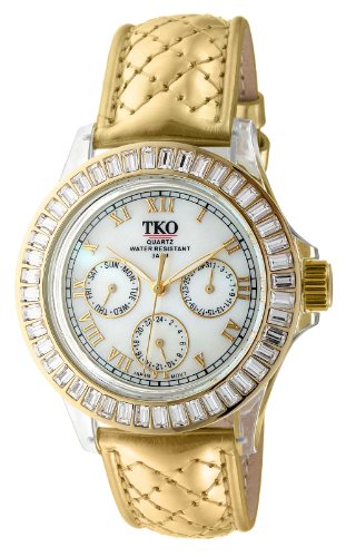 TKO ORLOGI Women's TK518-GD Capri Swarovski Crystal Accented Metallic Plastic Case Quilted Gold Genuine Leather Strap Watch Feature