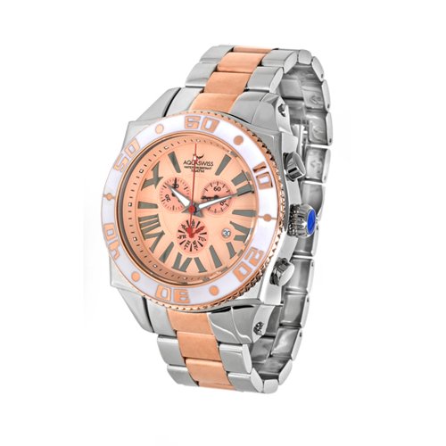 Conveying time with style and functionality, Aquaswiss offers a fine line of Chronograph stainless steel watches. Aquaswiss chronograph timepiece is designed with a precision Swiss movement, chronograph sub-dials, and offering the utmost sophistication in chronograph watches. The men's watch features a heavy constructed polished steel case measuring 50mm wide and 63mm in length with 15mm thickness and a unidirectional rotating rose gold plated bezel inlaid with white enamel and rose gold numerals. The watch is powered by Swiss quartz Chronograph day and date movement for precision and accuracy. It's equipped with a peach dial with silver-tone roman numerals and luminous hands, red chronograph runner hand, chronograph sub-dials, date calendar at four o'clock and a gold minute marker encircles the dial. The band is solid stainless steel silver and rose gold IP plated measuring 24mm wide with a hidden push button deployment clasp. The watch is water resistant to 10 ATM and comes with screw-down locking crown. Manufacturers two year warranty.