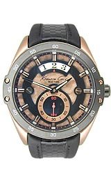Copper-tone stainless steel case with a black leather bracelet. Fixed black ion-plated bezel. Black and copper-tone dial with luminous hands and stick hour markers. Minute markers arond the outer rim. Luminiscent hands and markers. Date displat appears at the 12 o'clock position. Seconds sub-dial appears above the 12 o'clock position. Japanese quartz movement. Scratch resistant mineral crystal. Black ion-plated crown. Solid case back. Tang clasp. Water resistant at 50 meters / 165 feet. Kenneth Cole Retrograde Date Black Leather Mens Watch KC1487.