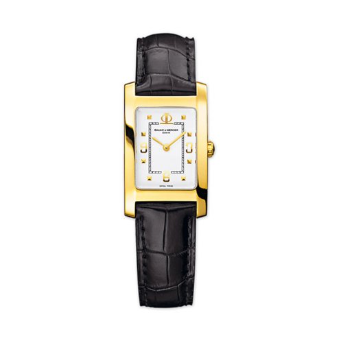 The Baume & Mercier Men's Hampton Swiss Strap Watch features a polished 18-karat-yellow-gold design offset by a clean white dial for a look that complements most casual daytime and semi-formal attire. Hampton is Baume & Mercier's icon watch and refers to the Hampton's, situated on Long Island, off New York, where the way of life exudes harmony and serenity. Halfway between tradition and modernity, its slightly curved case hugs the wrist perfectly. Hamptons retro-contemporary design makes it a great classic of our time. Constructed with a yellow-gold case, the watch includes a polished rectangular yellow-gold bezel, and a textured brown leather wristband secured with a buckle clasp. A scratch-resistant-sapphire window shields the white dial, which features gold-stud hour markers with Arabic numerals at three, six, and nine o'clock. The dial also includes slim black minute markers and golden watch hands. Featuring Swiss-quartz movement, the timepiece is water resistant to 99 feet (30 M).