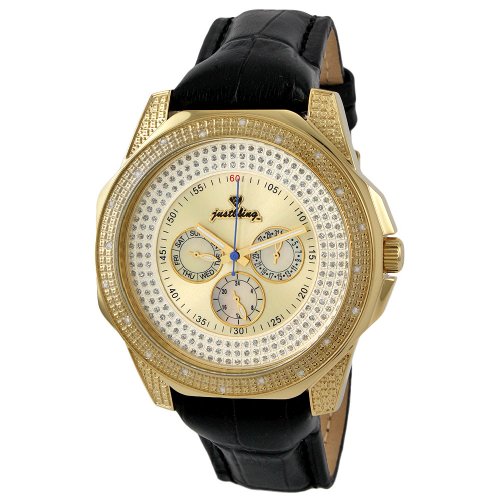 Product Description: This truly exclusive watch with a designer dial and an alluring, diamond accented bezel adds extra intrigue to Just Bling’s Classic collection. A diamond encrusted removable bezel combined with gold accents is offset by a 50-millimeter 18k gold plated all stainless steel case. The stylish combination of black leather band with shiny gold-toned case gives the timepiece a unique and bold look. The 24-millimeter flexible, genuine crocodile leather band with a deployment clasp is firmly fixed to the case lugs. The uniquely constructed sunray gold dial is surrounded by blocks of crystal accents and black second markers. This designer dial includes 3 mother-of-pearl sub dials, luminous hands for hour, minute and multi functions. The firm gold look with crystal accents, designer dial, and black leather band makes this classic timepiece a perfect pick for any occassion. This watch is water resistant up to 5 ATM (50Meters/165 feet). Classic Collection: In the world of luxury watches, Just Bling’s Classic Collection stands alone by offering timeless, traditional craftsmanship while also providing enduring style. Emphasizing on creating contemporary and sophisticated designs for everyday wear, this collection achieves its place in line with today’s fashion. This collection offers a myriad of enticing options including metal bands, leather straps, large mother-of-pearl dials, traditional chronographs, removable bezels, and applied indexes. The charming appearance combined with growing variety and conscientious value of this distinctive Just Bling’s Classic Collection manifests every watch connoisseur’s hopes and dreams.