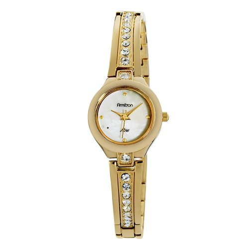 The Armitron NOW Women's Swarovski Crystal-Accented Gold-Toned Bangle Watch shows off a delicate and dazzling design with shimmering crystals giving off a beautiful shine. The polished, round, gold-toned case is complemented by a matching polished bezel. The white mother-of-pearl dial features gold-toned round indices at the three, six, nine, and twelve o'clock hours along side matching gold-toned hour, minute, and sweeping second hands. The gold-toned bangle-style bracelet features a single center row of stunning Swarovski crystals, fits comfortably, and securely fastens by jewelry clasp. This timepiece offers reliable Japanese quartz movement and is protected by a durable mineral crystal.