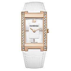 With its delicate crystal pavé and rose gold plating, this exquisite watch offers a trendy touch of vintage style. Specifications: case - rose gold PVD with clear crystal pavé, 27x41mm; dial - white silver coloured sunray pattern; numbers - 10 hand-applied clear crystals with swan at 12 o'clock; strap - white leather with embossed crocodile structure; movement - Swiss quartz.