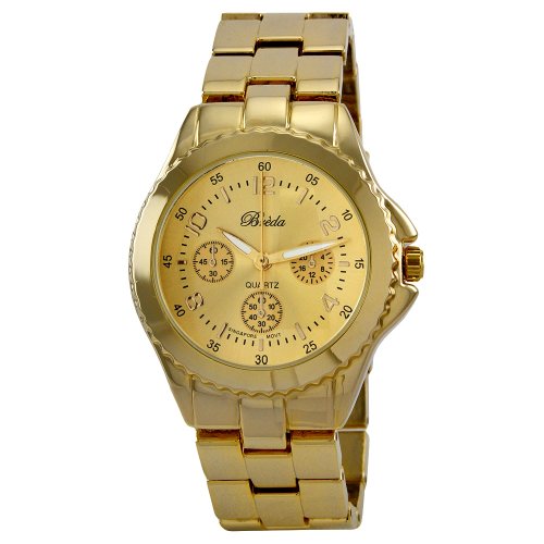 8128_gold Dress your every day wardrobe with this watch! The Abigail Breda watch is a great accessory for every day wear because of its classic look. This watch a functional look with a modern flair. Features: -Watch. -Color: Gold. -Case material: Metal. -Metal band. -Highest standard Japanese quartz movement. -Gold metal three link bracelet, fold over clasp. -Gold dial marked with monochromatic hour markers and seconds. -3 Non working gold monochromatic non working subdials to give a sporty look. -Water resistant, not suggested for shower or water use. -Case diameter: 34mm. -Band width: 18mm.