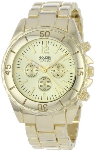 The evolution of classic sophistication continues with the "Timeless Chic" collection from Golden Classic. Taking its cues from fashion's recent return to traditional ideals, this collection offers everlasting style and enticing designs bestowing utmost elegance upon its owner. The timepieces found in this collection exude classic charm, making a perfect match for any occasion. Known for eternal style combined with impeccable design, the "Timeless Chic" collection will be by your side, transcending fashion by day or by night. 2287-gold Features: -Watch. -Color: Gold. -Band material: Metal. -Fold over clasp with double push button safety. -Highest standard Quartz movement. -Faux tachymeter markings on contrasting bezel. -Gold dial with three non-working chronograph sub dials. -Contrasting hour and minute markers. -Not recommended for shower or water use. -Case diameter: 1.5''. -Case thickness: 0.39''. -Band width: 0.71''.